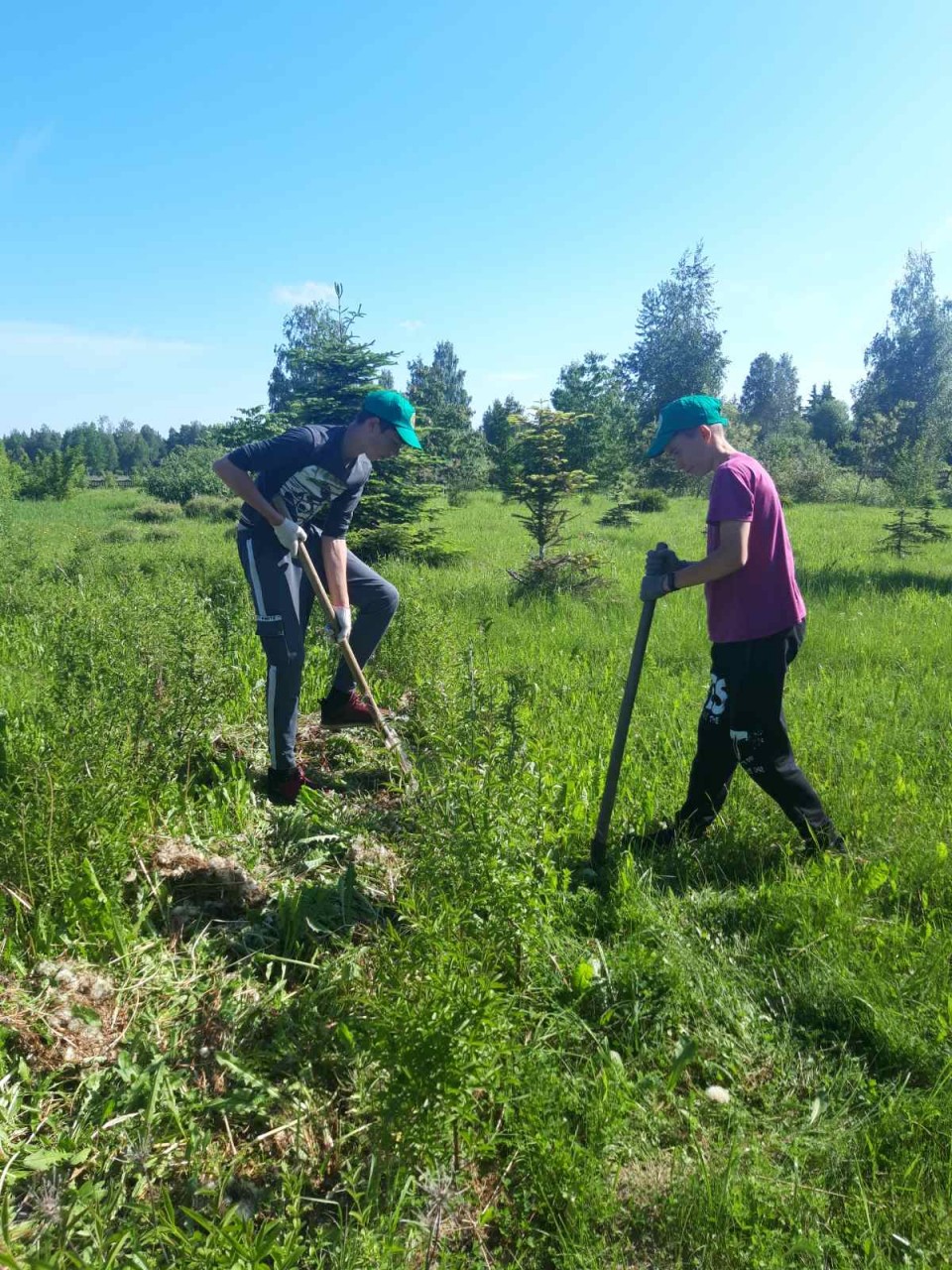 Яшчэ адна група дзяцей з СШ №1 працуе ў гадавальніку, дзе займаюцца праполкай маленькіх елачак.