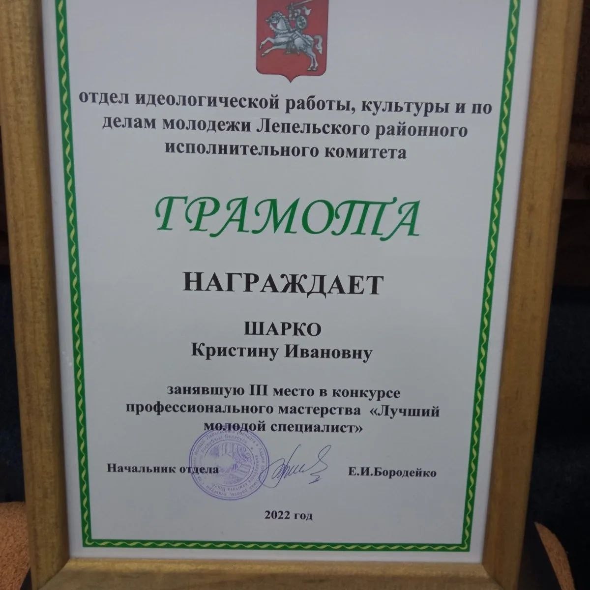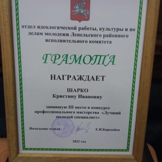 Молодой специалист Кристина Шарко приняла участие в конкурсе профессионального мастерства "Лучший молодой специалист" и заняла третье место