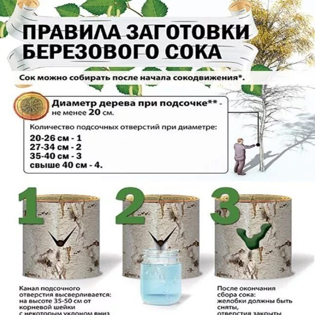 Для заготовки древесных соков назначаются деревья диаметром 20 сантиметров и более.