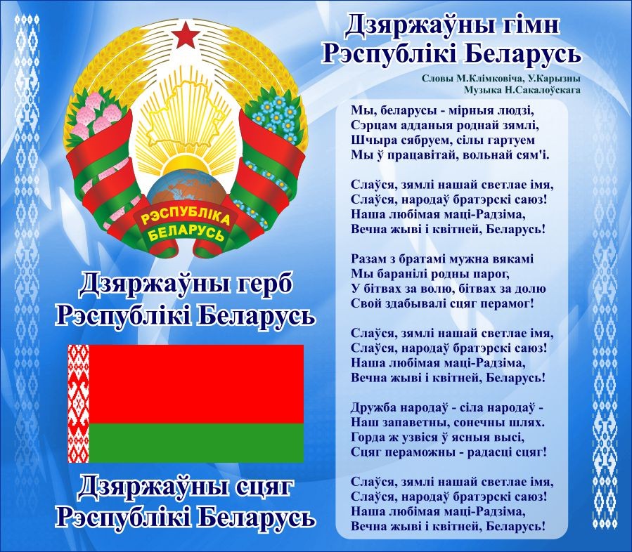 Государственный гимн Республики Беларусь представляет собой музыкально-поэтическое произведение, исполняемое в торжественных случаях, перечень которых закрепляется в законодательстве. Музыку к гимну написали белорусский композитор Н.Ф.Соколовский, слова - белорусские поэты М.Н.Климкович и В.И.Каризна. Слова Государственного гимна отражают условия развития Республики Беларусь как суверенного, миролюбивого государства, подчеркивают патриотизм и трудолюбие граждан, братское отношение между представителями всех национальностей, проживающих на территории страны.